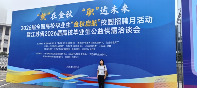 2025年9月27日,2026届全国高校毕业生“金秋启航”校园招聘月活动暨江苏省2026届高校毕业生公益供需洽谈会火热开启。信息工程系就业干事老师陈莉娟带领部分2026届学生积极参加此次招聘会,为学生就业求职保驾护航。
