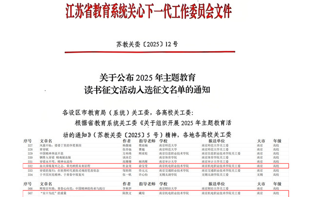 近日,江苏省教育系统关工委印发《关于公布2025 年主题教育读书征文活动入选征文名单的通知》(苏教关委〔2025〕12 号)。我校学子在此次评选中斩获佳绩,共有 1 篇征文获评优秀、2 篇征文获评入围。
