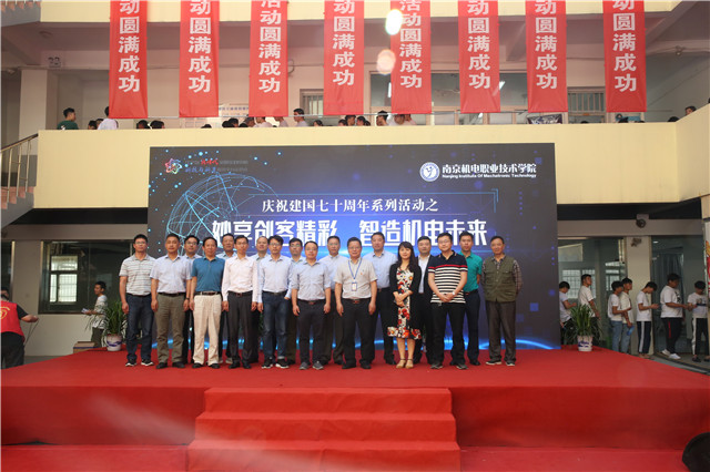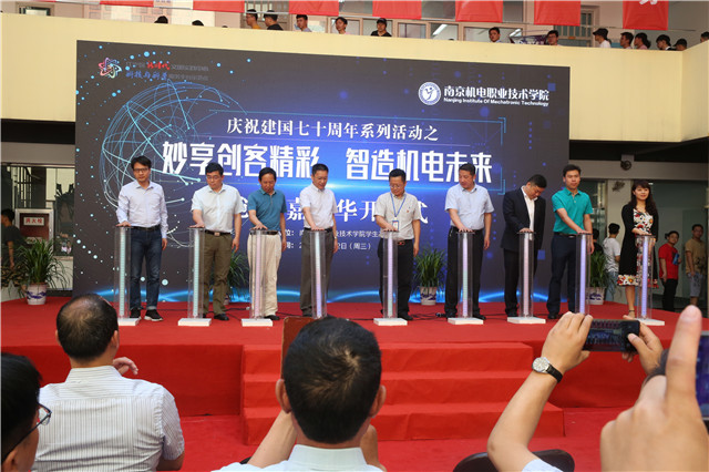 为激发广大创客创新潜能和源动力,传达创客生活方式,展示创客校园建设成果,丰富创客文化,促进创客交流,探讨创客教育的理论与实践,引领创客教育,2019年5月22日,南京机电职业技术学院庆祝中华人民共和国成立70周年系列活动之“妙享创客精彩 ,智造机电未来”2019年第三届创客嘉年华在学院知行楼中庭举行了盛大的开幕仪式。南京机电职业技术学院党委书记、院长周庆礼、南京机电产业集团党委书记、总经理卢北宁、南京市教育局职教教研室主任章鸿、南京工程学院工业中心副主任,创新创业学院副院长陈巍 、江宁科学技术协会副主席姚本祥、南京市东山小学副校长李一婷等校内外领导和嘉宾出席了开幕仪式。