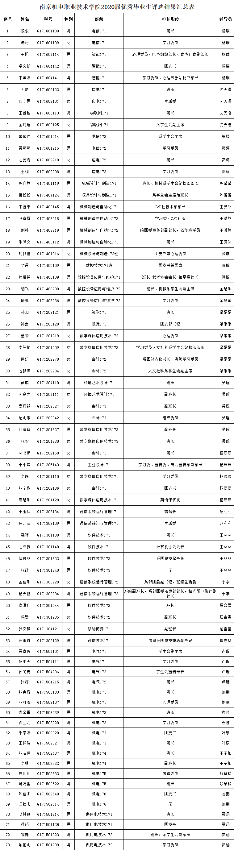 根据南机电院 学[2]号《关于评选2020届优秀毕业生的通知》,经班级评选,系部审核,学工处复核,决定拟推荐以下73名同学为2020届南京机电职业技术学院优秀毕业生。现予以公示,公示时间:2020年6月24日—2020年6月30日。联系人:宁燕,电话:025-84190262,18061230078。