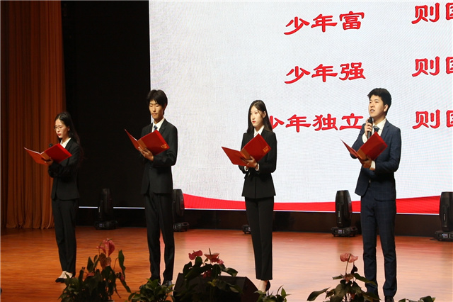 而由李晨舟、刘若彬、阎昱臻、吕雯妮四位同学铿锵朗诵的《少年中国说》以及张家豪、陈昊演唱的歌曲《少年中国说》将全场气氛推向了高潮,舞台上各系代表同学手握着鲜艳的五星红旗伴着歌声挥舞。借此,孙主任向在场学生郑重介绍了在资助宣传工作上给予了她支持和帮助的资助宣传大使团队成员:信息工程系丰凡顺、自动化工程系许超、电子工程系韩涵、机械工程系张弟、人文社科系许庆雯,并对他们表示感谢及肯定。同时呼吁了在场所有学生向所有即将离校实习的学长学姐们一起加油打气,全体起立大声高喊“实习,加油!实习,顺利!”在此振奋人心,鼓舞士气的气氛中活动圆满落下帷幕。