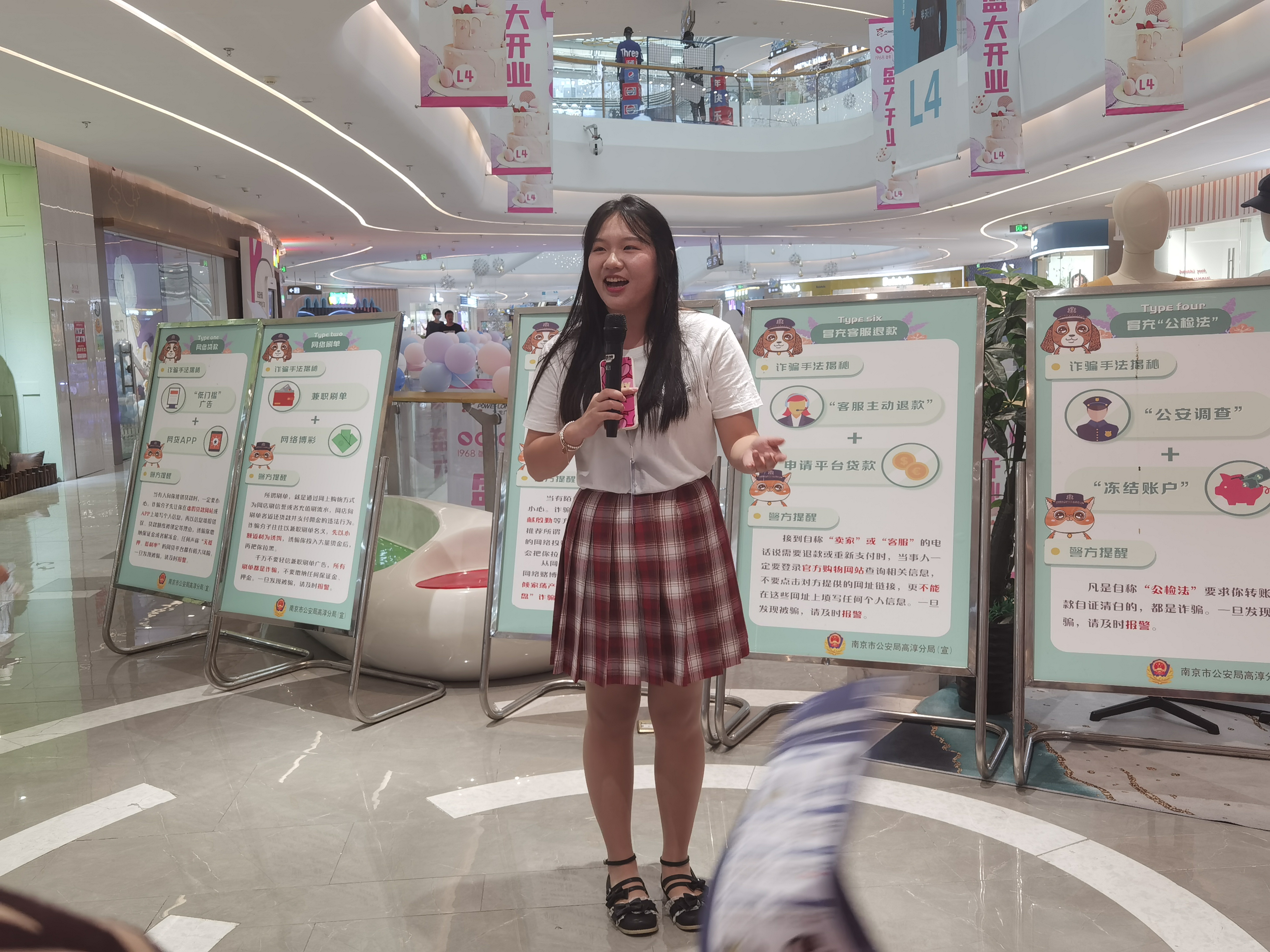 活动开始,首先由我院反诈宣讲员在宝龙广场二楼大厅进行反诈骗宣讲。阎昱臻,乔云柯,冯琪翔三位宣讲员针对亲子家长,围绕网络刷单,冒充老师及杀猪盘为主题,进行深入浅出的讲解,并与在场群众热烈交流。随后淳溪派出所三位民警对宣讲内容进行总结,让大家认识到电信诈骗的基本手段。