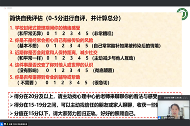 培训开始陆菁老师让心理委员们做了一个简快自我评估,评估在当前疫情下校园封闭管理期间同学们的个人心理状况,明确什么样的同学需要寻求外界帮助。