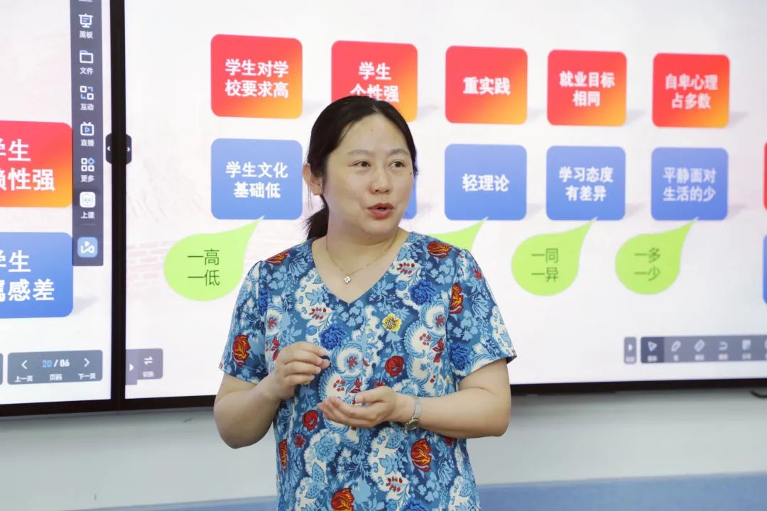 郏老师从认识我们的学生、认识我们的职业教育、认知我们的职业,重构我们的理念,提升我们的素质等五个方面进行分享交流,所讲内容引起了在场老师的共鸣,纷纷表示将今天的培训学习与个人自学相结合,对照标准找准差距,弥补不足,提升自我,把本次培训内容、精神贯穿到实际工作中去。