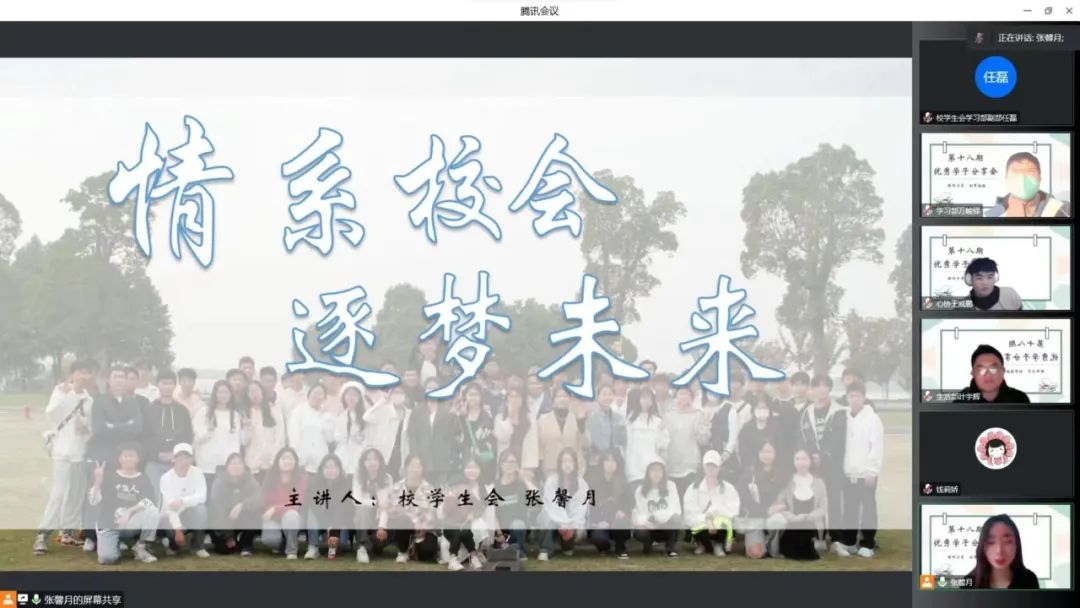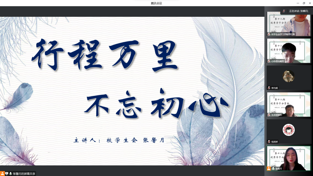 为发挥身边榜样的传、帮、带作用,引导广大学子树立奋进目标,助力我校学生在求知路上不断进取,开阔眼界,2022年12月30日下午,校学生会通过线上腾讯会议顺利开展第十八期优秀学子分享会。本次分享会由校学生会主席张馨月担任主讲人,一百余名同学参加本次活动。