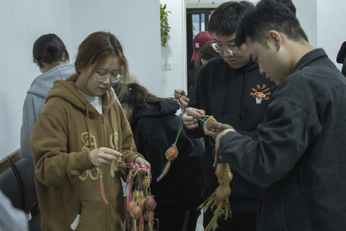 4月17日,五彩蛋袋编织活动在宿舍区开展,大管中心周长花老师准备了五颜六色的彩线,并为大家演示蛋袋的编织方法。听完讲解,同学们迫不及待的动起手来,先将每股80CM长的线对折挂于长绳上,在线对折的地方系一个0.5CM左右长的结。在第一个结下1CM处,将第一股线的一半与相邻一股线的一半打结,以此类推,直至形成一个环。按蛋的大小,打5-6层的结即可,最后下面留8CM左右长的穗子。很快同学们手中的彩线就变成了一个个五彩蛋袋,尽显传统文化的魅力。