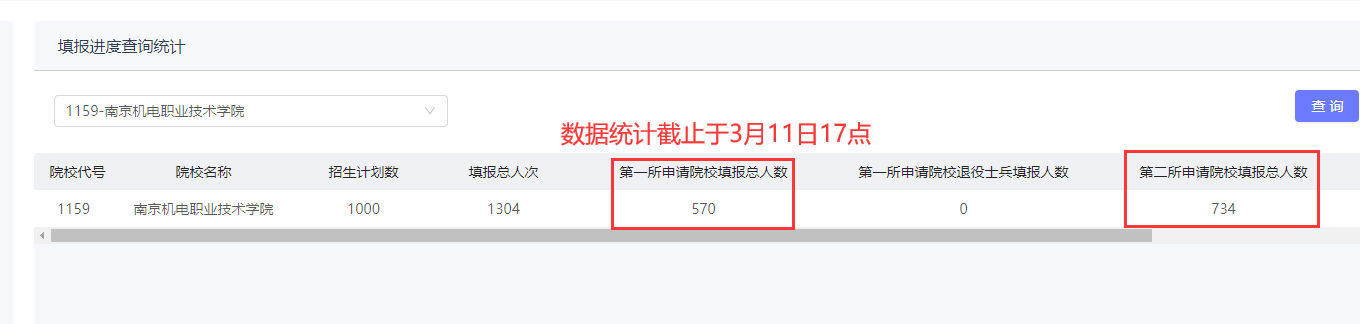 南京机电职业技术学院截至2021年3月11日晚上17点,提前招生成功报名人数为1304人,其中一志愿填报我校人数为570人,第二志愿填报我校人数为734人。我校2021年提前招生总计划为1000人。