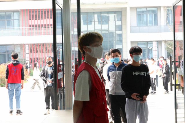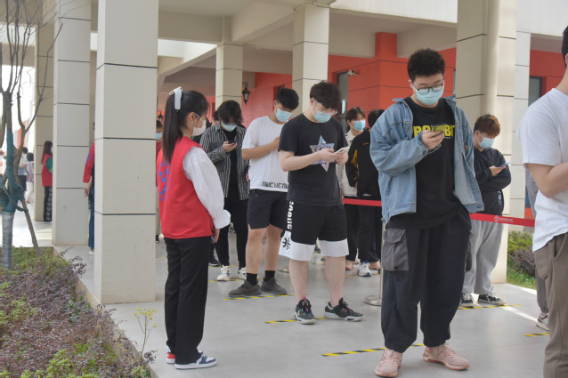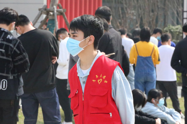接到核酸采样检测任务后,学校广大党员冲锋在前开展志愿服务工作,学生志愿者紧急支援,现场筑起“青春防线”。全员的共同努力使检测工作高效有序地进行。