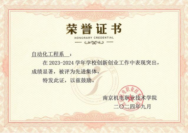 喜报:自动化工程系获评2023-2024学年学校创新创业工作先进集体