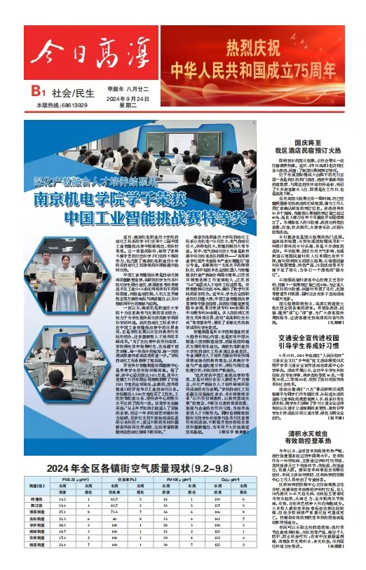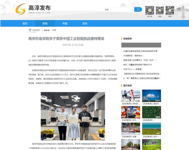 日前,《高淳发布》和《今日高淳》报纸B1版报道了南京机电职业技术学院自动化工程系学子荣获中国工业智能挑战赛特等奖。全文如下: