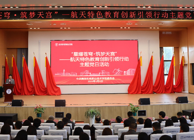 3月6日,“星耀苍穹・筑梦天宫”航天特色教育主题党日活动在学校乐学楼101报告厅举行。中国航天科技集团有限公司党组副书记、董事方向明,中国人才研究会副会长、航天科技教育联盟秘书长、北京航天探索馆馆长周岫彬,航天科技集团党群工作部三级业务经理张广科,北京神舟航天软件技术股份有限公司市场营销部主管张凇铭,学校党委书记、校长周庆礼,党委委员、副校长刁爱军,党委委员、副校长孔德丽,党委委员、纪委书记姜振宇,党委委员夏玲玲、党委委员高水冕出席活动。自动化工程系全体党员、2023级入党积极分子和部分学生代表80余人全程参与活动。