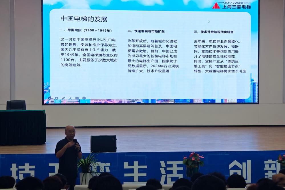 秦勇泉深耕电梯及智能制造领域多年,拥有丰富的技术研发与产业实践经验。讲座中,他以“梯载匠心传匠艺智引职途向未来”为主题,结合自身从业经历,从“产业创新趋势”“智能制造技术应用”“机电专业职业发展路径”三个维度展开分享,用生动的案例解析了当前自动化、机电一体化领域的技术突破与行业需求,生动展示了“匠心”在现代工业中的重要性,为新生们搭建起“专业学习”与“产业实践”之间的桥梁,帮助新生建立对所学专业的清晰认知,明确职业发展方向。