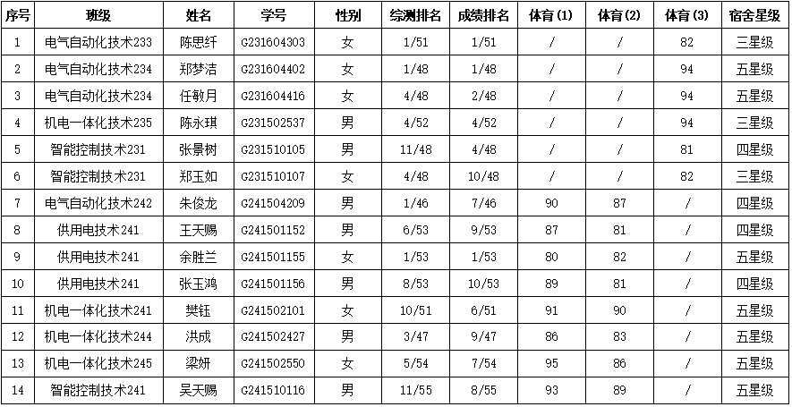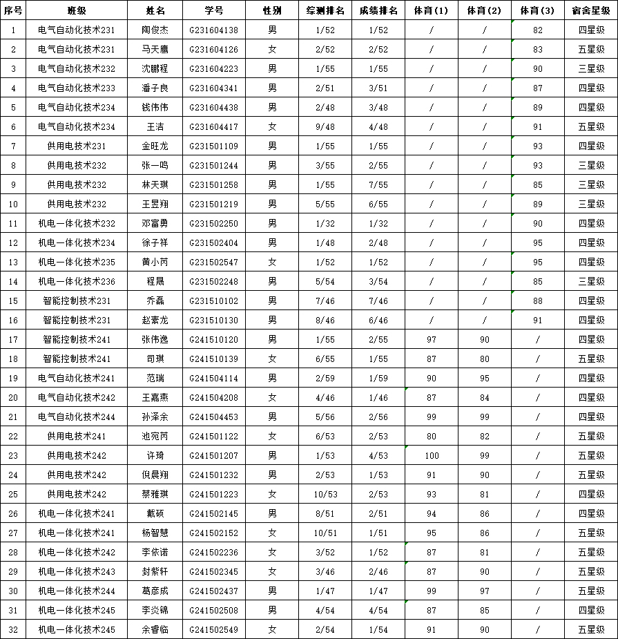 根据《南京机电职业技术学院校级三好学生、优秀学生干部、优秀毕业生、先进班集体评定办法》和《关于评选2024-2025学年三好学生、优秀学生干部和先进班集体的通知》等文件精神,经个人申请、班级评议、院系审核,拟推荐陶俊杰等32名同学申报校级“三好学生”,陈思纤等14名同学申报校级“优秀学生干部”。