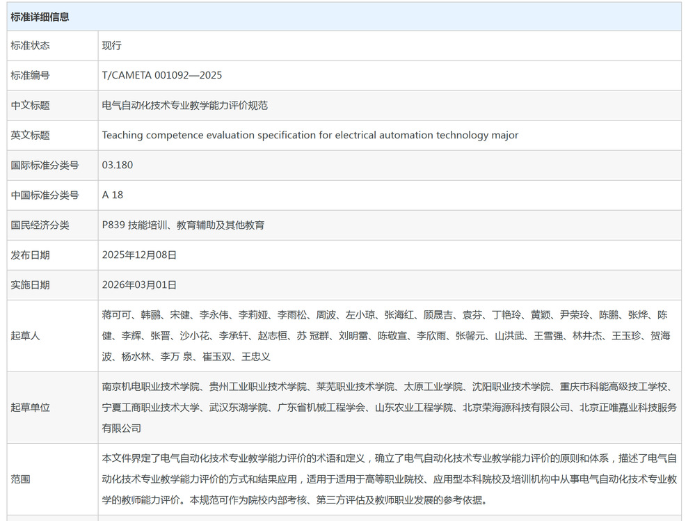该规范的实施将有力促进电气自动化技术教师队伍的专业化、标准化建设,帮助院校精准对标行业企业需求,优化课程体系与教学模式,从而为社会持续输送具备扎实专业知识、卓越工程实践能力与强烈创新精神的优秀技术技能人才。