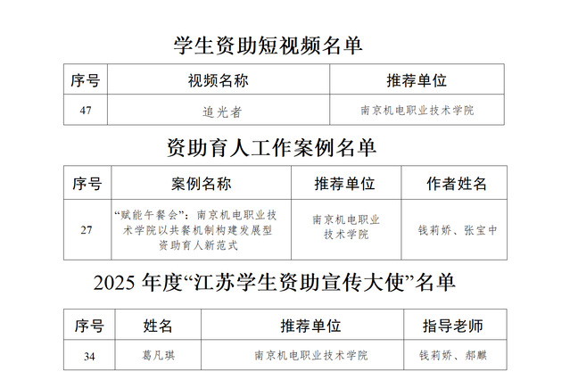 由钱莉娇、朱丹丹指导,葛凡琪同学及资助宣传大使团队拍摄的资助短视频《追光者》入选学生资助短视频优秀作品。由张宝中、钱莉娇撰写的案例《“赋能午餐会”:南京机电职业技术学院以共餐机制构建发展型资助育人新范式》入选资助育人工作典型案例。信息工程系2023级学生葛凡琪获评2025年度“江苏学生资助宣传大使”,我校学子连续3年获此殊荣。