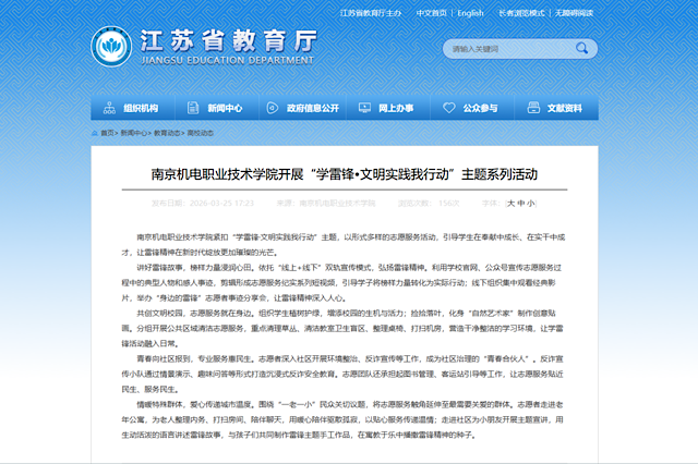 南京机电职业技术学院紧扣“学雷锋·文明实践我行动”主题,以形式多样的志愿服务活动,引导学生在奉献中成长、在实干中成才,让雷锋精神在新时代绽放更加璀璨的光芒。