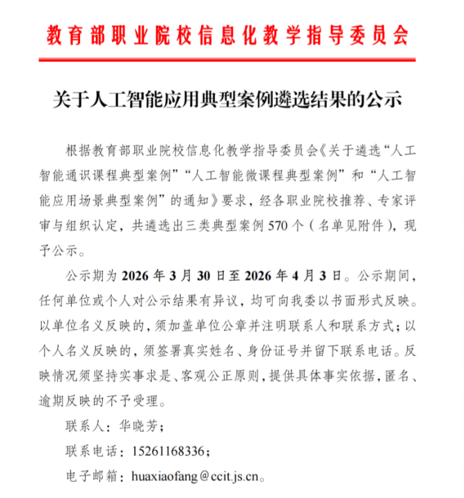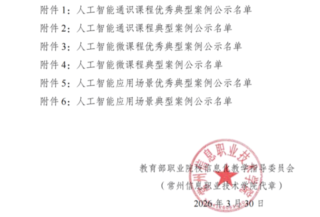 近日,教育部职业院校信息化教学指导委员会公布2026年人工智能应用典型案例遴选结果,本次遴选共评出200项优秀典型案例(其中通识课程50项、微课程100项、应用场景50项),我校在本次评选中表现突出,成果丰硕。
