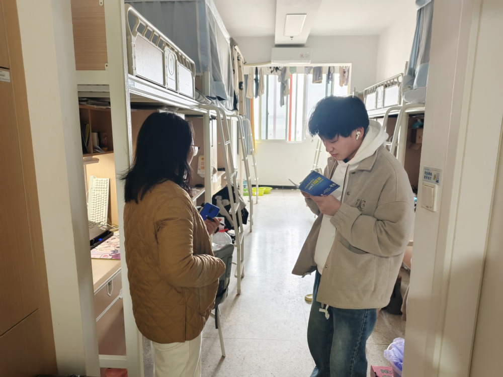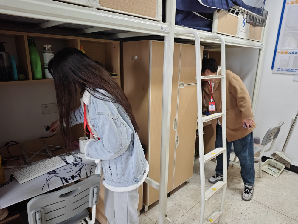 活动现场,各小组有序深入宿舍,同步推进卫生检查、禁烟管控、安全排查、反诈普及四项核心工作,全程规范高效。卫生排查对照标准逐项核查,针对床铺整理、地面清洁、卫生死角等问题现场打分,引导学生立行立改,优化住宿环境;禁烟管控重点排查违规吸烟痕迹,对相关学生开展警示教育,宣讲吸烟危害,共建清新住宿氛围。