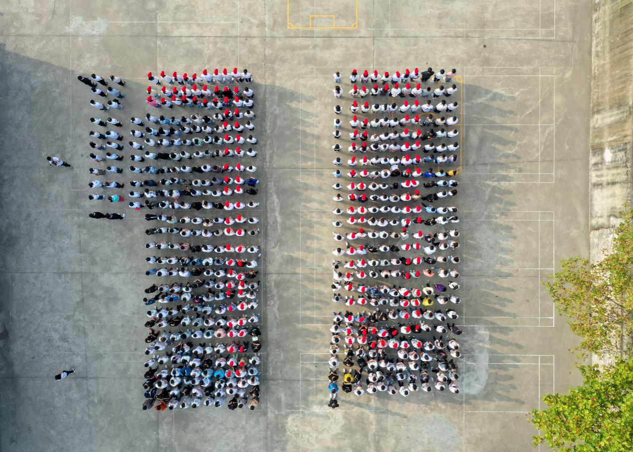 清晨七点,迎着初升的朝阳,南京机电职业技术学院650余名师生满怀崇敬之情聚集在操场,153名同学在队伍中用小红帽摆出“70”字样。