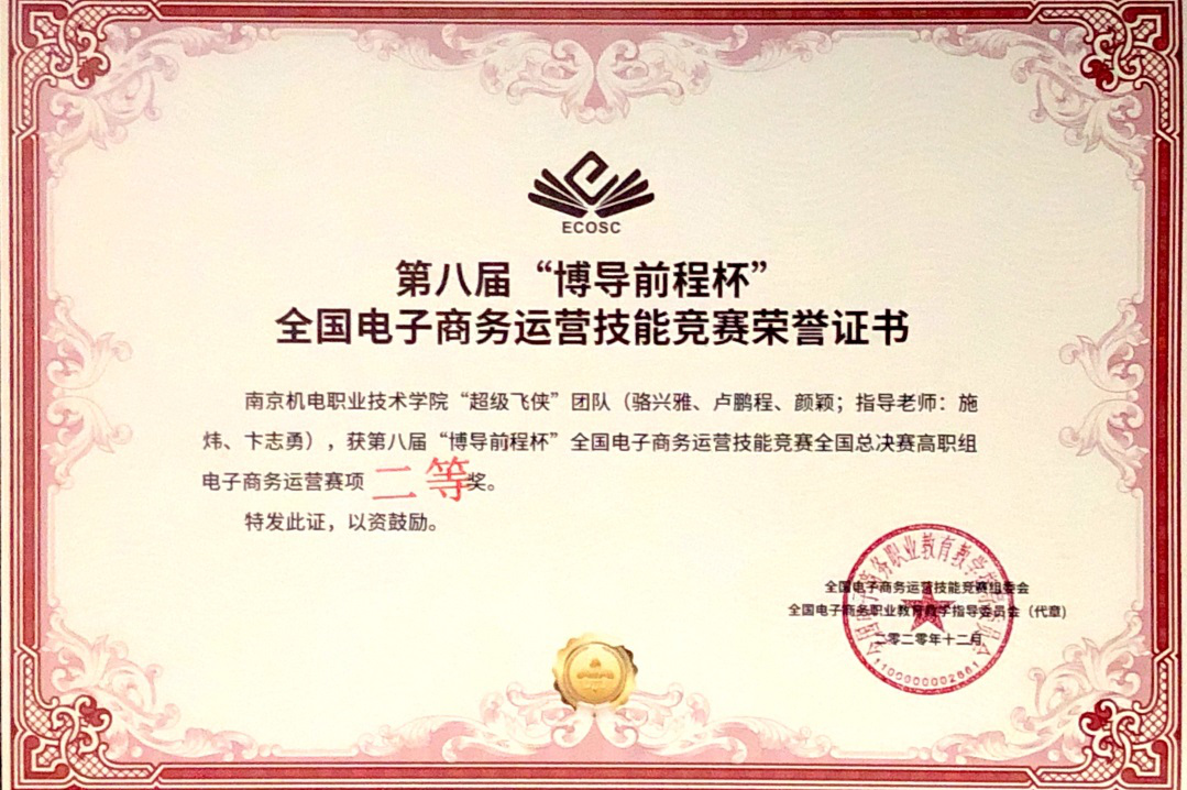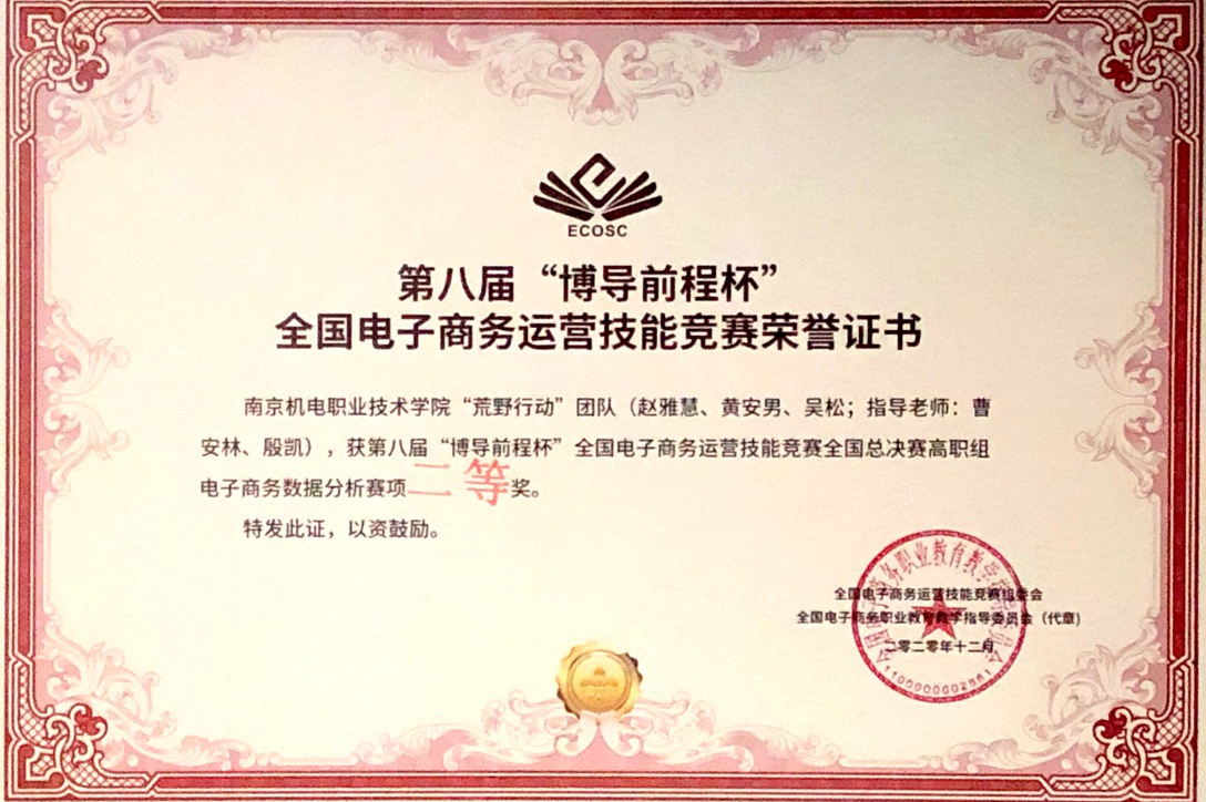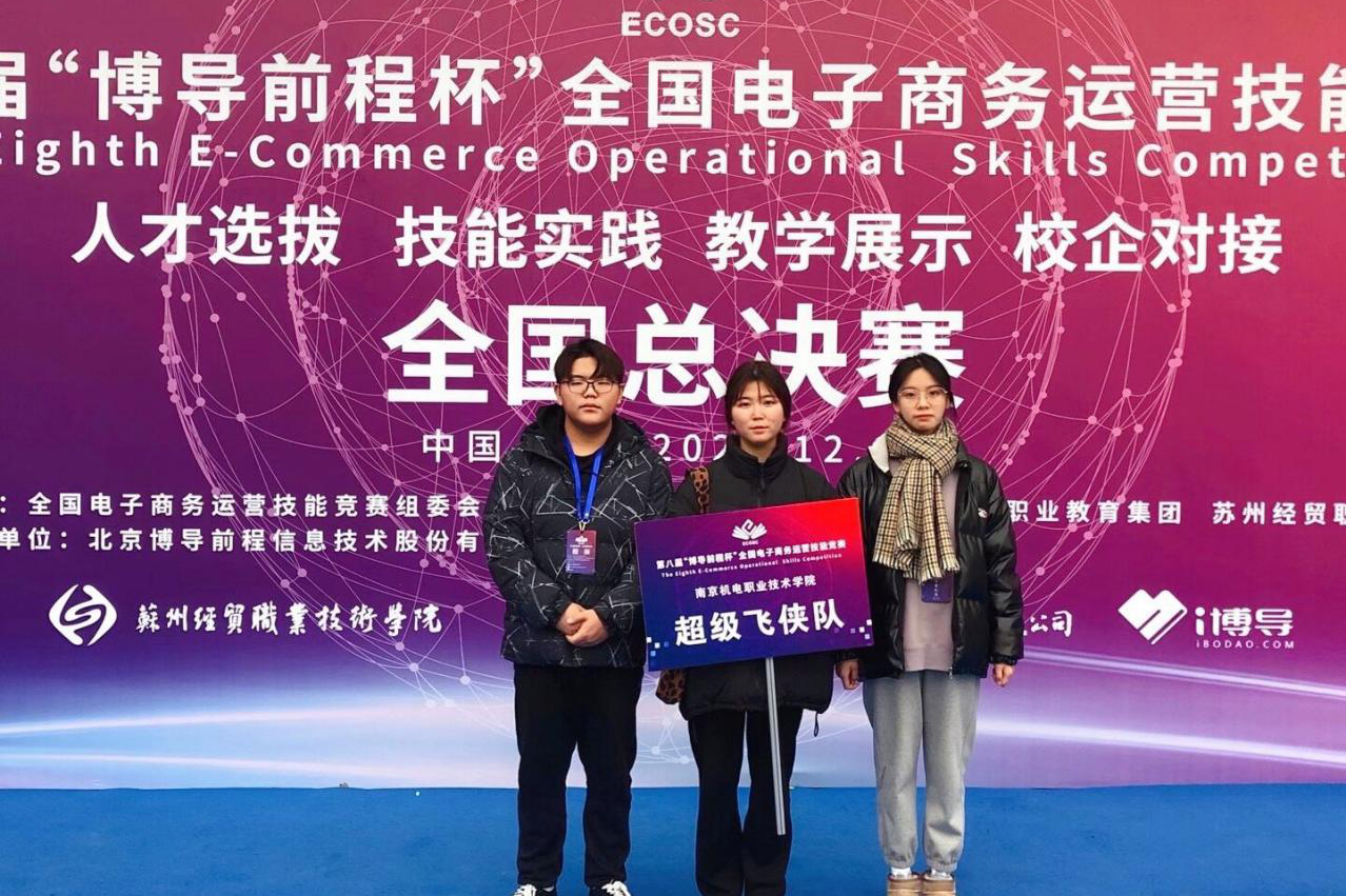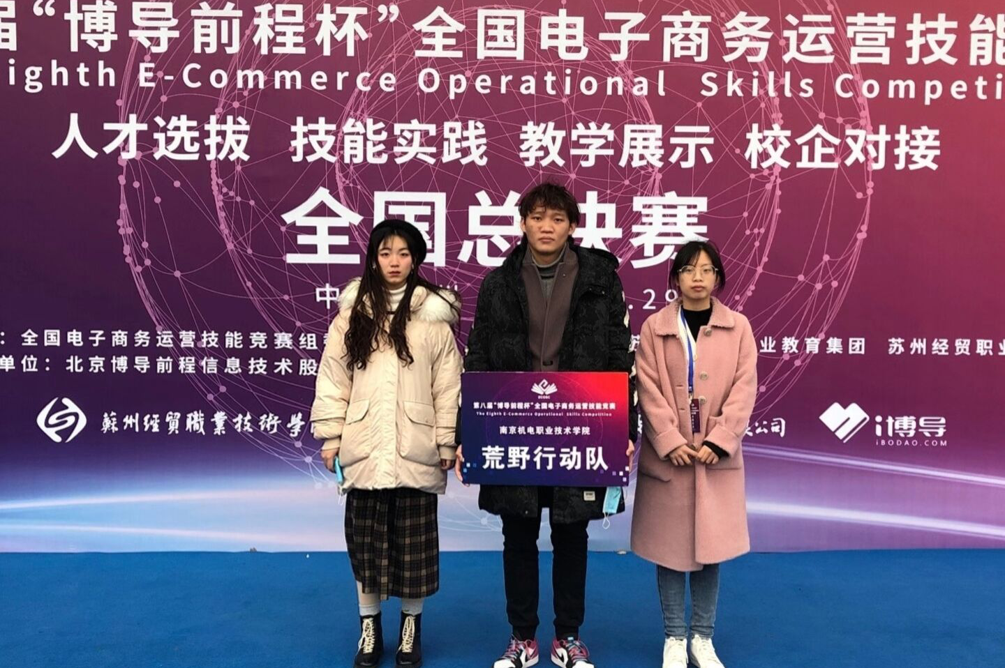 2020年12月29日,第八届“博导前程杯”全国电子商务运营竞赛决赛在苏州经贸职业技术学院举行。南京机电职业技术学院电子商务运营“超级飞侠队”团队(骆兴雅、卢鹏程、颜颖;指导老师:施炜、陈洁)以及电子商务数据分析“荒野行动队”团队(赵雅慧、吴松、黄安男;指导老师:殷凯、曹安林)双双荣获高职组全国总决赛二等奖。