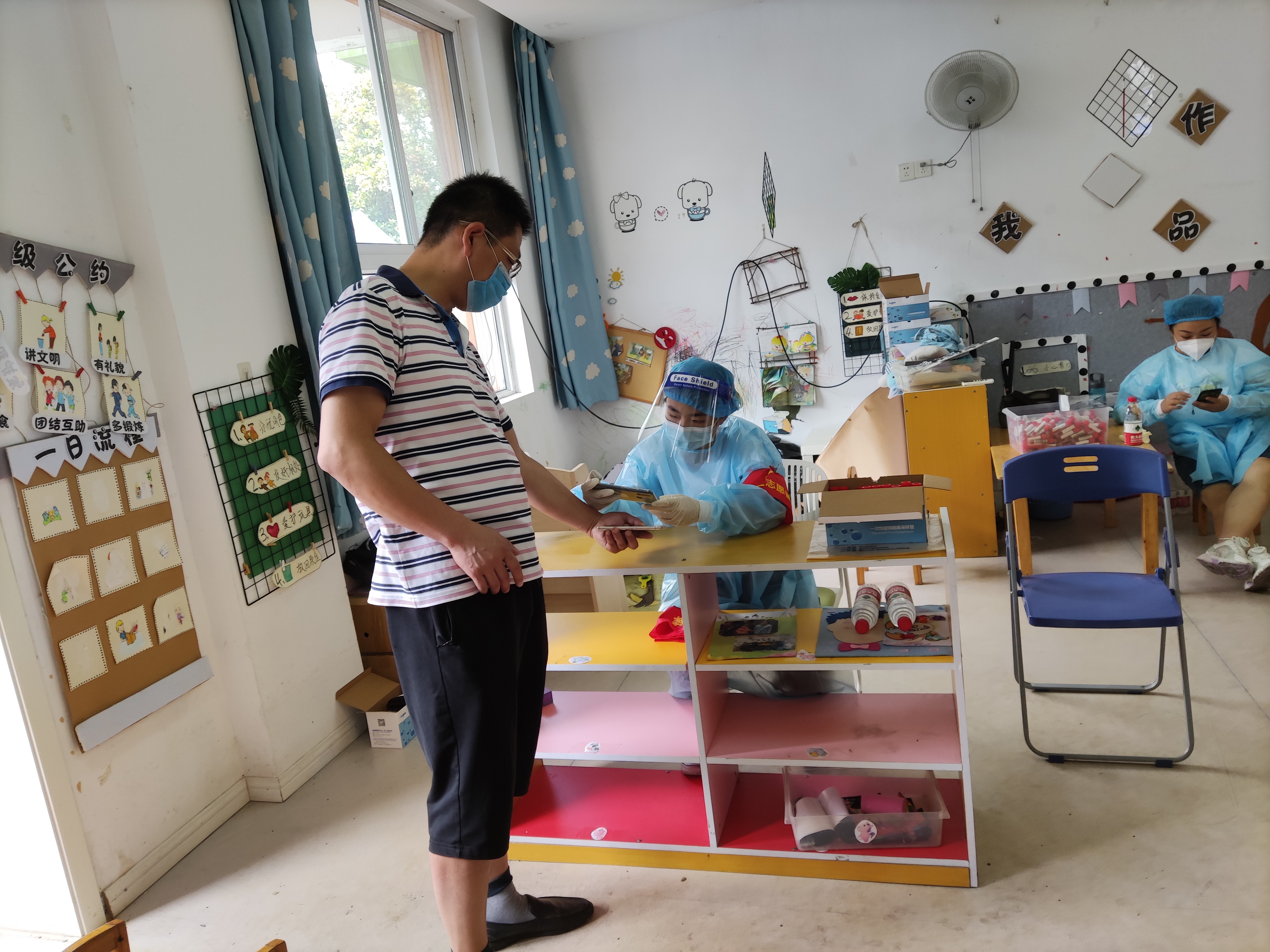 在此期间,目睹那些志愿者在疫情防控一线上挥汗如雨,我深受触动,下定决心要为疫情防控献出自己的一份力量。于是,我光荣的成为了一名志愿者。我深知这不仅是一份责任,更是一份担当,一个属于新时代青年的担当,一个属于南京机电学子的担当。在岗位上,我一天奔波了五个流动检测点,每到一个检测点就要穿戴好隔离服,做好全面的病毒消杀,在每个流动核酸检测点登记黄码和经停机场人员的单独采样信息是我的职责,光是一上午我就登记了整整两百个检测样本,虽然天气炎热,我也没有一丝怨言。