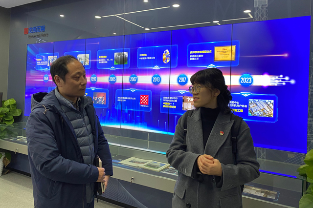 在总经理助理潘志强、人力资源部主任王亚东等高管的陪同下,信息工程系师生一行参观了该公司办公区和企业文化区,深入了解了中邮建技术有限公司的党建成果和企业文化。随后,双方在公司会议室召开了研讨会,就党建引领校企合作、人才培养、专业设置、实习实训等方面进行了深入的交流。